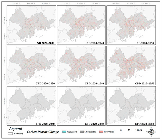 Next, we analyzed the spatial and temporal variations in carbon storage to delineate the spatiotemporal dynamics of the carbon storage changes in the PRDUA over time. Changes were categorized into three distinct classes: “increase”, “decrease”, and “no change”. The results are presented in Figure 9. Under the ND scenario, the carbon storage distribution within the PRDUA demonstrated a pattern characterized by small-scale scattered increases at the periphery and widespread scattered decreases in the central region. Over 30 years, the focus of carbon loss was on the central part of the study area, particularly in Guangzhou and Foshan, mainly as a result of the swift expansion of built-up areas, converting high-carbon-density agricultural land and forest land into low-carbon-density construction land. Regions with notable increases in carbon storage were predominantly small and isolated, yet their overall impact was minimal. Interestingly, localized carbon accumulation was also observed in the central zones that experienced significant carbon loss. In the CPD scenario, the extent of the scattered decreases in the central regions expanded outward and became relatively concentrated compared with the ND scenario. Urban greening initiatives have contributed to an increase in carbon storage. Under the EPD scenario, stringent forest protection and enhanced reforestation efforts led to substantial carbon sequestration. Simultaneously, measures were implemented to safeguard agricultural land and grasslands, thereby reducing the transition rate. In this scenario, the areas with decreased carbon storage were significantly reduced, whereas those with increased carbon storage expanded. As economic development progressed, cities continued to grow, and the ecological benefits of this scenario became more pronounced in areas where carbon neutrality had been achieved.