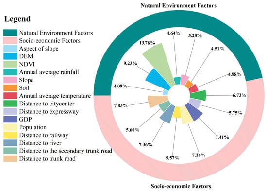 The driving mechanisms of the LUCC in LEAS module of the PLUS model calculated the contribution value of 15 drivers of changes to land use types, including seven natural environmental factors and eight socioeconomic factors. The results are presented in Figure 10.