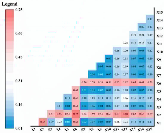 Dominant interactive factors of carbon storage changes in 2020 (X1 is distance to railway, X2 is annual average rainfall, X3 is slope, X4 is soi1, X5 is distance to the secondary trunk road, X6 is annual average temperature, X7 is aspect of slope, X8 is sistance to city center, X9 is distance to expressway, X10 is distance to trunk road, X11 is DEM, X12 is GDP, X13 is NDVI, X14 is population, X15 is distance to river).