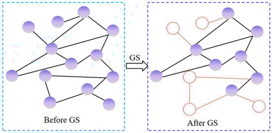 To efficiently and accurately perform TSA, this paper proposes a Graph Simplification-based spatiotemporal graph convolutional network (GS-STGCN) model, as illustrated in Figure 3. The model includes several key components: a GS module, two STGCN layers with a residual structure, and four fully connected layers followed by a SoftMax layer. The GS module preprocesses electrical measurement data by removing redundant information, enhancing computational efficiency, and allowing the model to focus on relevant features. The STGCN layers extract spatial and temporal features from the graph data, capturing complex patterns in power system behavior over time. The residual structure between the STGCN layers facilitates gradient flow during backpropagation, mitigating the vanishing gradient problem and enabling deeper architectures without sacrificing performance. The four fully connected layers process the extracted features, allowing the model to learn complex interactions. This architecture improves the model’s generalization and prediction accuracy. Finally, the SoftMax layer converts the outputs into probability distributions over stability classes, yielding the final stability assessment result. This structured approach ensures that the GS-STGCN model effectively integrates graph simplification, feature extraction, and classification for reliable TSA.