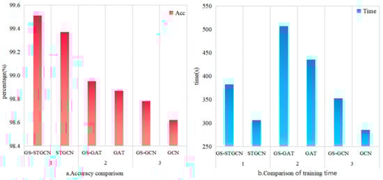 To verify the superiority of the GS-STGCN model for TSA, it is compared against the SVM [32], GCN [21], GAT [22], and LSTM [16] models. The SVM model uses a radial basis function (RBF) kernel, with sample feature data transformed into a one-dimensional format to meet the kernel’s requirements. The LSTM model comprises two LSTM layers, followed by a fully connected layer and a SoftMax output layer. The GCN model consists of two stacked GCN layers, a fully connected layer, and a SoftMax output layer. Similarly, the GAT model consists of two stacked GAT layers, a fully connected layer, and a SoftMax output layer. The first GAT layer utilizes eight attention heads, while the second GAT layer employs two attention heads, with the outputs from these heads averaged. All DL models use the IFL loss function and the Adam optimization algorithm. The pruning parameter for the GS-STGCN model is set to 0.3. The performance results of the five models are presented in Table 1.