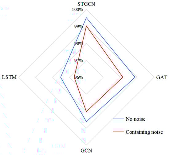 In practical online applications, the test dataset is derived from real-time PMU data. Given the inherent variability in PMU measurements of dynamic data, some level of error is inevitable. To assess the robustness of the model, Gaussian white noise—characterized by instantaneous values following a Gaussian distribution and uniform power spectral density—is introduced to the test set to simulate the measurement errors typically encountered in real-world scenarios. The trained models are then evaluated using the test set augmented with Gaussian white noise. The accuracy of various models under noisy conditions is displayed as Figure 5.
