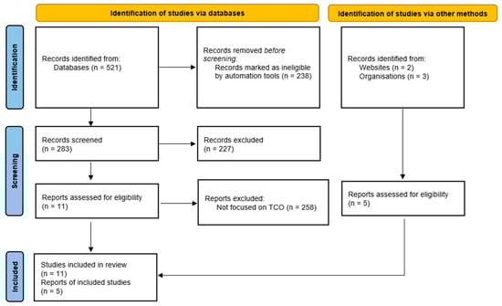 In the pursuit of understanding the economic competitiveness of hydrogen buses we initiated a systematic literature review following the PRISMA guidelines (Figure 1) [10,11]. This preliminary overview was followed by a narrative examination of a curated selection of papers and reports. Our approach involved identifying relevant academic literature, including papers, articles, proceedings, and reviews. We conducted targeted string searches within the Scopus and WOS databases, without imposing temporal restrictions. This analysis resulted in 521 references. Refining by subject area (economic, social, environmental and energy related sciences) and considering only papers in English, we selected 283 papers. Only 11 papers reported TCO specific keywords. Table 1 presents the keywords selected for querying Scopus and WOS databases to sound out papers title, abstract and keywords published between 1975 and July 2024.