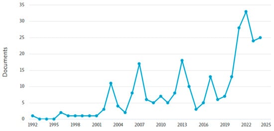 A bibliometric analysis was conducted on papers obtained by refining search keywords to observe research trends over the years. From 1992 to 2003, the number of studies was limited and infrequent, with a peak in 2007 (Figure 2). However, starting from 2020, there has been a noticeable increase in publications [15].