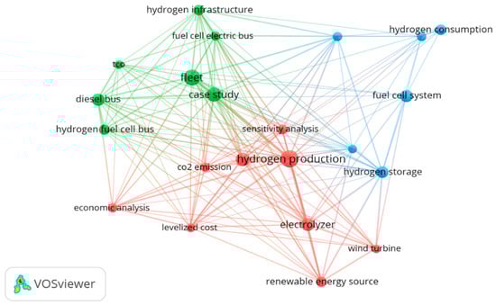 VOS viewer (version 1.6.20) was employed to visualize thematic groupings of the most significant research areas within the investigated domain [13]. By identifying frequently co-occurring terms in abstracts (with a minimum threshold of ten occurrences), VOS viewer identifies clusters of related documents. These clusters represent thematic groups, providing insights into the major themes in the research field. Figure 4 displays the terms/words co-occurrences networks grouped in main 3 clusters. The research in this area adopts a distinctly technical approach. The red cluster emphasizes hydrogen production, electrolysis, and the analysis of hydrogen generation from renewable sources, with a focus on minimizing CO2 emissions. Simulations and sensitivity analyses play a crucial role within this cluster. The blue cluster centres around storage technologies, fuel cells, and optimizing hydrogen consumption efficiency. Lastly, the green cluster reflects a recent surge of interest in economic analysis. This trend is further supported by bibliometric data and initial studies on the TCO for bus fleets. These studies compare the costs and performance of hydrogen buses against the benchmark, typically represented by diesel buses.