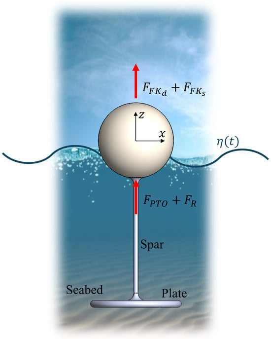 where m is the dry mass of the buoy, is the displacement of the buoy from equilibrium, and are the hydrostatic and hydrodynamic Froude–Krylov forces, respectively, is the gravitational force, is the diffraction force, is the radiation force, and is the PTO force.