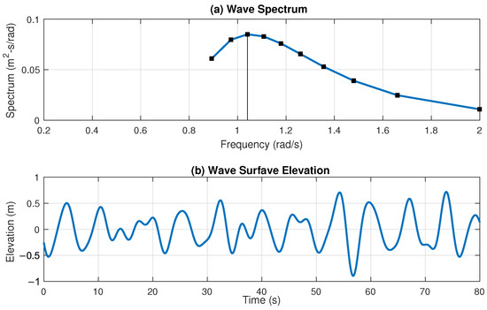 such that is the wave amplitude component, is the phase shift, is the wave number, and is the angular frequency. Using Equation (5), the time series irregular wave elevation can, thus, be expressed as .