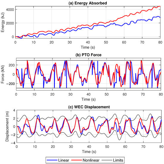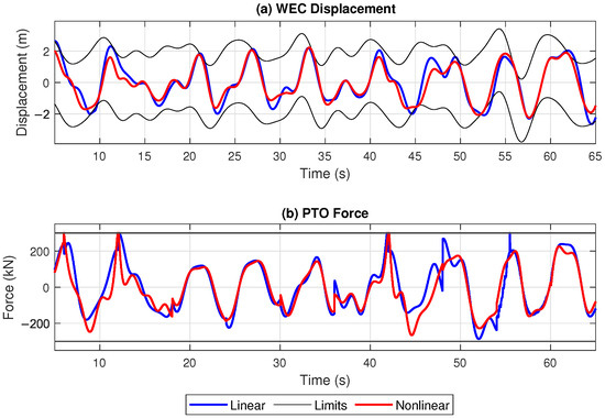 However, it is important to note that the linear MPC, while producing more power at higher wave periods, often fails to comply with displacement constraints. Figure 8 illustrates this issue, showing the displacement of the WEC and the PTO force with their respective constraints for a wave with an energy period = 9 s and = 1.5 m. In this scenario, although the linear model is slightly better than the NLMPC in power output, the WEC displacement frequently exceeds the constraint limits. This could potentially lead to system damage if not adjusted for real-world conditions.