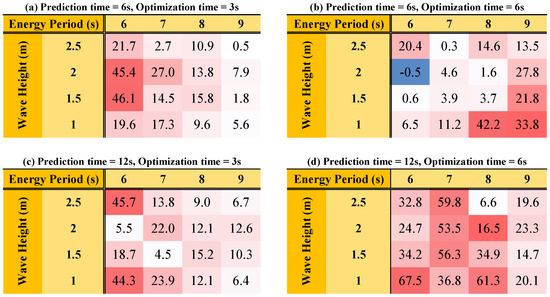 Percentage power performance difference between linear and nonlinear MPC models for different prediction horizons and optimization times . (a) = 6 s and = 3 s, (b) = 6 s and = 6 s, (c) = 12 s and = 3 s, (d) 12 s and = 6 s.