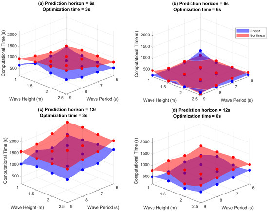 Overall, the computational time for both models increases with the wave height, but not significantly. Additionally, there is no consistent correlation between computational time and increasing wave periods, as trends vary depending on the prediction horizon and optimization time configuration. However, it is clear that increasing the prediction horizon and maintaining the same optimization time, as shown in plots (a) and (c), as well as (b) and (d), result in an average increase in computational time by factors of 2 and 3, respectively.