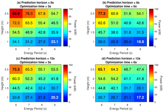 The analysis of the power matrices also indicates that changes in optimization time () significantly influence power absorption. For instance, reducing in the case of increases the mean power absorbed by an average of 23%. While shorter optimization times lead to higher energy production, they also require greater computational demands. Similar to the impact of the prediction horizon on power production, decreasing does not necessarily result in higher power production, indicating the need to carefully consider these settings to optimize both power output and computational resources effectively.