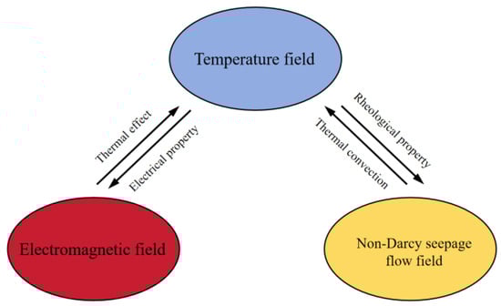 Schematic diagram of the coupling of the electromagnetic field, temperature field, and seepage flow field.
