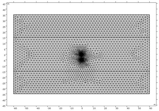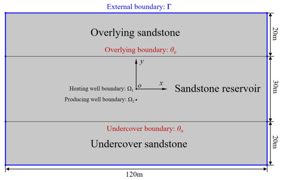The vertical cross section of the physical model in Figure 1 is taken as the research object, and the diagram of the geometry for the simulation model is shown in Figure 3. The heating well is located in the center of the heavy oil reservoir, and the production well is located 5 m below the vertical direction of the heating well. In this geometry, the thickness of the reservoir is 30 m, the radial horizontal width along the wellbore is 60 m, and the thicknesses of the overlying and undercover sandstone are 20 m. Γ is the outer boundary of the whole geometry of the reservoir and the overlying and undercover sandstone; Ω1 is the boundary of the heating well; Ω2 is the boundary of the producing well; θo is the boundary between the overlying sandstone and the reservoir. θu is the boundary between the undercover sandstone and the reservoir. In this model, the assumptions are as follows: all area boundaries are continuous smooth boundaries; the heating well is heated via a line source, and the electric field intensity is distributed symmetrically along the heating well; the physical parameters of the overlying and undercover sandstone are homogeneous and isotropic; the reservoir sandstone is homogeneous, and all other physical parameters are isotropic except reservoir permeability; assuming local thermal equilibrium of the heavy oil reservoir, the rock and fluid in the formation always have the same temperature locally; the effect of hydrodynamic thermal dispersion is not considered; the water in the reservoir is irreducible water, and only heavy oil flows in the reservoir; the physical parameters of the overlying and undercover sandstone are the same as the physical parameters of the reservoir sandstone; the phase change of water in the reservoir is ignored.
