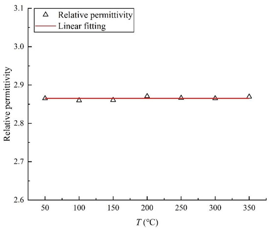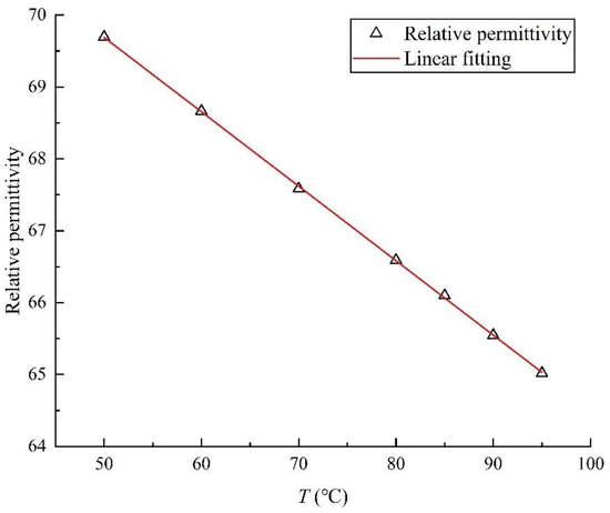 The relative permittivity of heavy oil was measured at different temperature points, and the experimental result is shown in Figure 4. The relative permittivity of heavy oil is a constant independent of temperature. Also, the relative permittivity of formation water was measured at different temperature points, and the experimental result is shown in Figure 5.