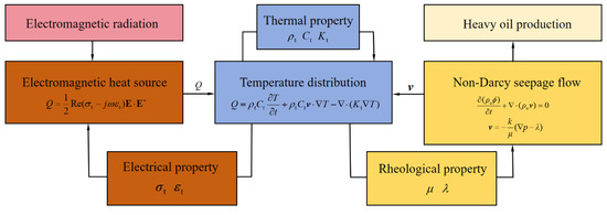 When the electromagnetic heater of the heating well is working, the electromagnetic wave acts on the polar molecules in heavy oil, and the electromagnetic energy is converted into heat energy under the effects of dipole polarization and ion conduction, and the volume heating of the reservoir is realized [28]. The viscosity and threshold pressure gradient of heavy oil will decrease with the increase in the temperature of the reservoir, which is conducive to the flow of heavy oil, and will also reduce the heavy oil density (fluid thermal expansion) [29], which will further affect reservoir pressure. In turn, the change in reservoir pressure will cause a change in the seepage flow velocity, affecting the heat convection and then causing a change in the temperature field. In addition, changes in the temperature and pressure fields causes deformation of the porous medium of the reservoir, which directly affects its porosity, so the threshold pressure gradient of the fluid flow, the relative permittivity of the reservoir, the thermal conductivity of the reservoir, and the specific heat capacity of the reservoir will also change, and finally, these changes affect the seepage flow field, temperature field, and electromagnetic field. Therefore, the electromagnetic in situ thermal recovery of heavy oil is a complex nonlinear seepage flow process under the coupling of the electromagnetic field, temperature field, and seepage flow field. The coupling relationship between the physical fields is shown in Figure 2.