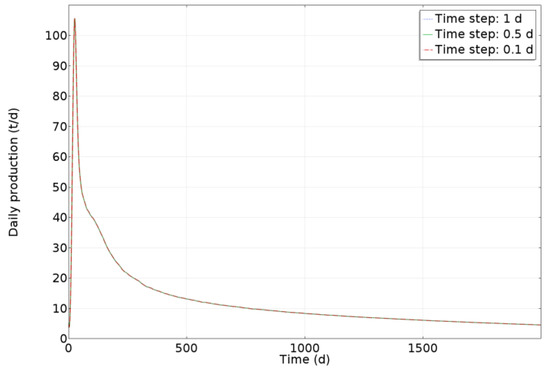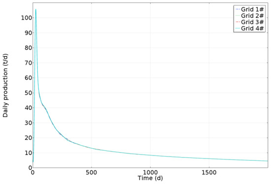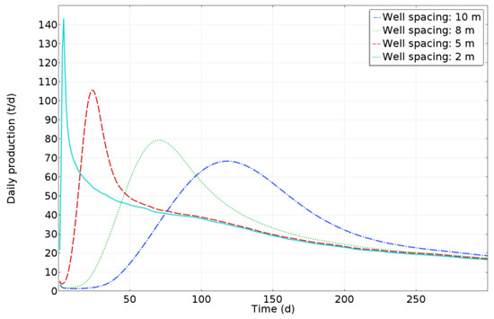 The production well is moved vertically to change the spacing between the heating well and the production well, and the heavy oil daily production is compared and analyzed under different well spacings of 10 m, 8 m, 5 m, and 2 m. Since there was little difference in daily production between different well spacings after 300 days of production, the daily production of the first 300 days of production was selected for comparison in order to facilitate observation. The comparison of heavy oil daily production under different well spacings is shown in Figure 25. The smaller the well spacing, the faster the daily production of heavy oil in the early stage of production, the shorter the time to reach the maximum daily production, and the higher the maximum production. This is because, in the case of smaller well spacing, the temperature near the production well rises faster, and the heavy oil fluidity near the production well is improved faster.
