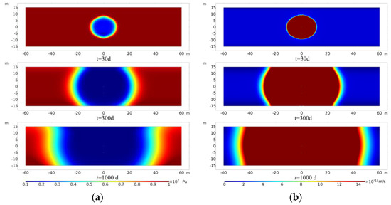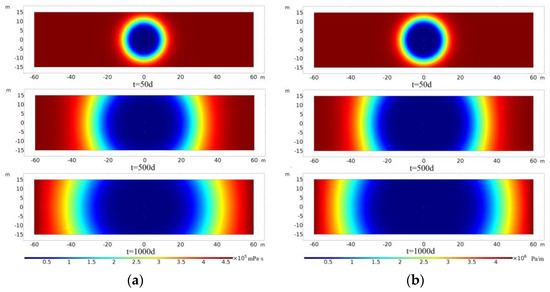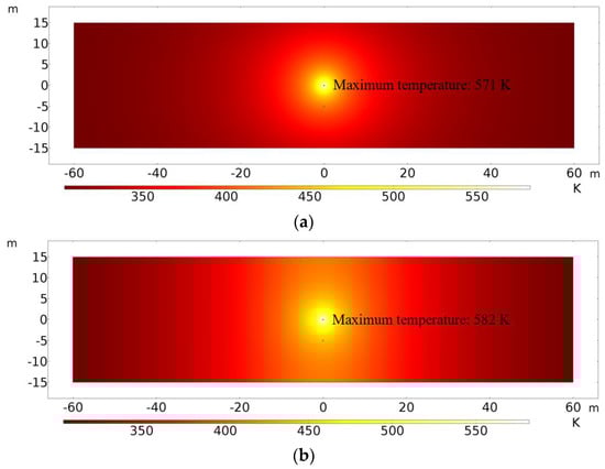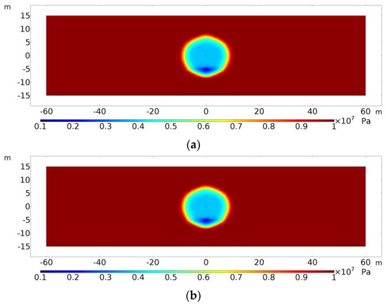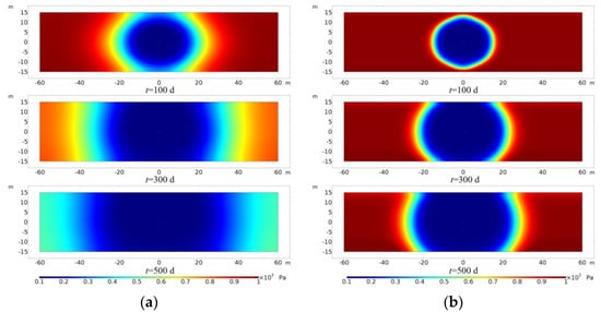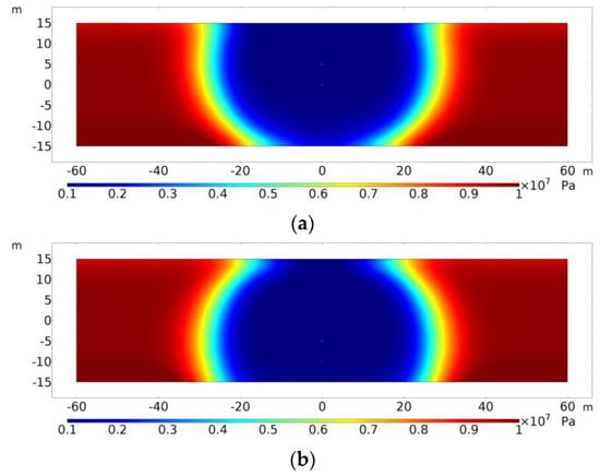 Comparison of reservoir pressure distribution at different heating and producing well assembly locations. (a) Distance of heating well from x-axis: +5 m; (b) distance of heating well from x-axis: −5 m.