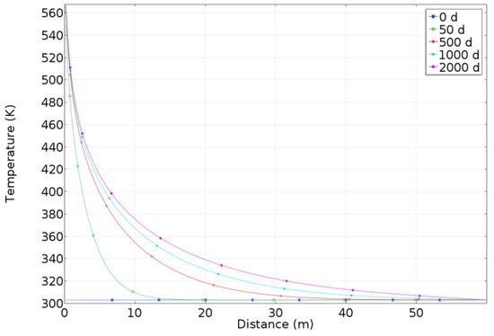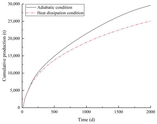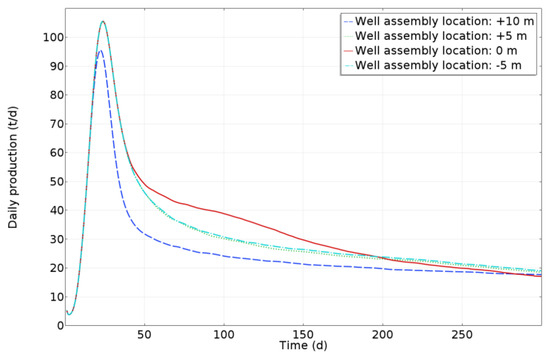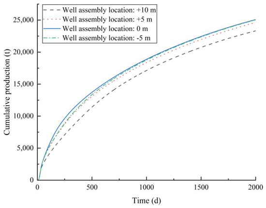 Keeping the spacing of the production well and heating well unchanged, we move the position of the heating well and production well in the vertical direction; and then, we analyzed and compared the heavy oil daily production of the production well corresponding to four different locations: the distance of the heating well from the x-axis (as shown in Figure 3) is set as +10 m, +5 m, 0 m, and −5 m, respectively. Obviously, if the location of the heating well is fixed, the location of the assembly of the heating well and producing well is fixed. Since there was little difference in daily production after 1000 days among the four locations, daily production in the first 1000 days of production was selected to make a distribution comparison chart for convenience of observation. The comparison of heavy oil daily production under different heating well locations is shown in Figure 28. When the heating well is located at +5 m and −5 m, the time required to reach the maximum daily production is the same as that at the center, and the daily production curves of the two are similar. However, when the heating well is located at −5 m, the daily production of heavy oil is slightly higher than that at +5 m. When the heating well is located at +10 m, the maximum daily production of heavy oil is lower than other locations. When the heating well is located at 0 m, the daily production of heavy oil before 200 days is the highest. This can be attributed to the reason that when the heating well is located at 0 m, i.e., at the center of the reservoir, the heat loss from the overlying and undercover sandstone is the least, and then the reservoir heating efficiency is the best. The cumulative production of heavy oil under different heating well locations is shown in Figure 29. When the heating well is located in the center of the reservoir, the cumulative production of heavy oil is the highest. This is because when the heating well is located in the center of the reservoir, the electromagnetic wave will dissipate the most energy through the reservoir. When the heating well moves up and down, the influence of the overlying and undercover sandstone on the heat loss will expand. Therefore, in this context, placing the heating well in the center of the reservoir is the most conducive to heavy oil production. It can also be seen from Figure 28 that the production of the heating well at −5 m is higher than that at +5 m. Take 500 days of production as an example, and the pressure distribution at these two places is shown in Figure 30. The upper part of the reservoir at +5 m has a larger pressure reduction range, while the lower part of the reservoir has a larger pressure reduction range. Due to the existence of gravity drainage, heavy oil in the lower part of the reservoir is more likely to flow out, so the heavy oil production at −5 m is higher than that at +5 m.