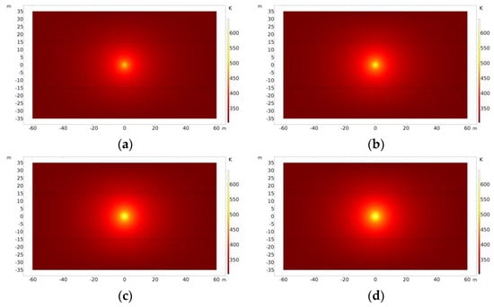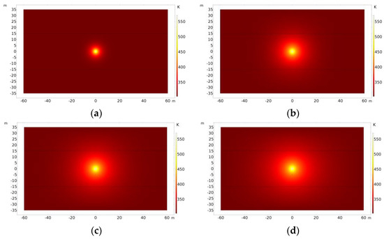 Reservoir temperature distribution after 2000 days of electromagnetic heating at different power levels. (a) Maximum temperature: 516 K (P = 500 kW); (b) maximum temperature: 571 K (P = 1000 kW); (c) maximum temperature: 628 K (P = 2000 kW); (d) maximum temperature: 647 K (P = 2500 kW).