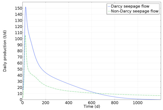 Comparison of heavy oil daily production between Darcy and non-Darcy flow.