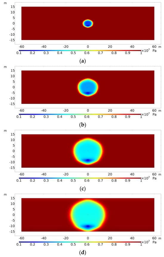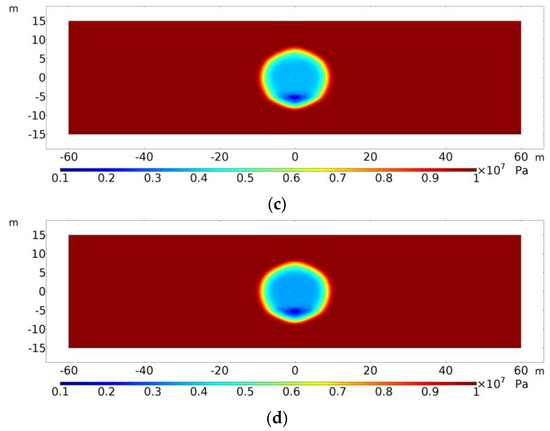 Reservoir pressure distribution when heavy oil reaches maximum daily production at different degrees of water saturation. (a) Sw = 0.4 (t = 31 d); (b) Sw = 0.37 (t = 29 d); (c) Sw = 0.33 (t = 26 d); (d) Sw = 0.3 (t = 24 d).