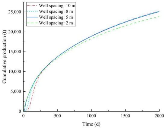 The distribution of reservoir pressure when heavy oil reaches the maximum daily production under different well spacings is shown in Figure 26. When the daily production of heavy oil reaches the maximum, the pressure near the producing well is significantly lower than that in other areas, and the heavy oil flow rate reaches the maximum under the action of a pressure gradient. The cumulative production of heavy oil under different well spacings is shown in Figure 27. In the initial stage of production, the cumulative production of those with smaller well spacing increased rapidly. With the increase in production time, the cumulative daily production of those with larger well spacing exceeded that of those with smaller well spacing. The corresponding cumulative daily production under different well spacings was 23,844 tons (2 m), 25,083 tons (5 m), 25,189 tons (8 m), and 25,242 tons (10 m). When the well spacing is larger, the production well location is lower, and a wider range of heavy oil in the reservoir above the production well is affected by gravity drainage, so the cumulative production is higher; however, the effect of the increase in well spacing on the production is reduced.