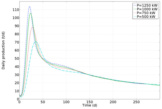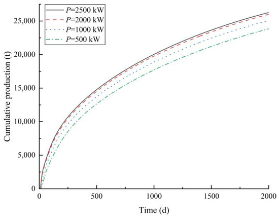 By changing the electromagnetic heating power, the heavy oil production under different power levels was compared and analyzed. Since the daily production of heavy oil under different power levels after 300 days of production is small, the daily production of heavy oil in the first 300 days of production is selected to make a distribution comparison chart for convenience of observation. Figure 31 shows the temperature distribution of the reservoir after 2000 days of electromagnetic heating under different power levels. The higher the power, the higher the reservoir temperature. The comparison of heavy oil daily production under different power levels is shown in Figure 32. The higher the power, the faster the daily production of heavy oil in the early stage of production, and the higher the maximum daily production of heavy oil. The cumulative production of heavy oil under different power levels is shown in Figure 33. The cumulative heavy oil production after 2000 days of production at different power levels is 23,847 tons (500 kW), 25,083 tons (1000 kW), 26,005 tons (2000 kW), and 26,267 tons (2500 kW), respectively. The greater the power, the higher the cumulative production of heavy oil. This is because the greater the power, the higher the reservoir temperature, the greater the reduction in the heavy oil viscosity and threshold pressure gradient, and the greater the improvement in the heavy oil fluidity, which is conducive to the production of heavy oil. Moreover, as the power value increases, its positive effect on the cumulative heavy oil production becomes less sensitive.