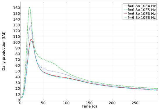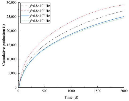 The production of heavy oil under different electromagnetic heating frequencies was compared and analyzed. After 300 days of production, the daily production of heavy oil at different frequencies has a small difference. In order to facilitate observation, the daily production of heavy oil in the first 300 days of production is selected for distribution comparison. The comparison of heavy oil daily production at different frequencies is shown in Figure 34. The maximum daily production of heavy oil first increases and then decreases with the increase in frequency, and the influence of frequency on the daily production of heavy oil is weakened with the increase in frequency. The cumulative production of heavy oil at different frequencies is shown in Figure 35. The cumulative production of heavy oil after 2000 days of production at different frequencies is 27,089 tons (6.8 × 104 Hz), 29,210 tons (6.8 × 105 Hz), 25,083 tons (6.8 × 106 Hz), and 24,606 tons (6.8 × 108 Hz), respectively. The transient cumulative production of heavy oil produced for 2000 days shows a trend of first rising and then decreasing with the increase in frequency. This is because, with the increase in frequency, the penetration ability of the electromagnetic wave becomes weaker, more energy is dissipated in the reservoir, and the reservoir temperature rises faster. At the same time, the heating ability of the electromagnetic wave to the far distance of the heating well is weakened. The increase in frequency has a weaker effect on the rise in reservoir temperature than the decrease in the distant heating effect of the reservoir, resulting in a decrease in the effective utilization range of the entire reservoir and a decrease in production, indicating that there is a frequency range of electromagnetic heating that is most conducive to reservoir exploitation for a specific reservoir.