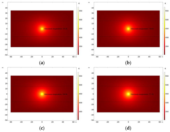 Temperature distribution of reservoirs under different degrees of water saturation. (a) Sw = 0.4; (b) Sw = 0.37; (c) Sw = 0.33; (d) Sw = 0.3.