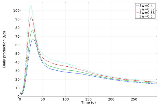 Comparison of heavy oil daily production at different degrees of water saturation.