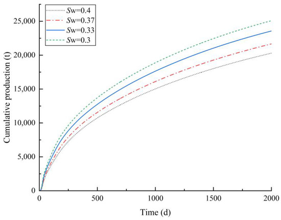 The influence of reservoir water saturation on heavy oil production was studied by changing the water saturation in the numerical model. The temperature distribution of reservoirs under different degrees of water saturation is shown in Figure 36. The higher the degree of reservoir water saturation, the slower the rise in heavy oil daily production and the lower the maximum daily production of heavy oil. The reservoir pressure distribution when heavy oil reaches the maximum daily production at different degrees of water saturation is shown in Figure 37. The comparison of heavy oil daily production under different degrees of water saturation is shown in Figure 38. Oil production initially decreases and then begins to increase. This can be attributed to the reason that initially, the heavy oil production has not been affected by the electromagnetic heating; due to too poor flow ability of the unheated heavy oil, the production decreases initially; and the heavy oil production begins to increase as it is affected by the electromagnetic heating after some time. The cumulative production of heavy oil under different degrees of water saturation is shown in Figure 39. The higher the degree of reservoir water saturation, the lower the cumulative heavy oil production, which is due to the larger specific heat capacity of water. When the degree of water saturation is higher, the lower the reservoir temperature, the lower the reduction range of heavy oil viscosity, and the higher the threshold pressure gradient under the same heating condition, so the improvement of heavy oil rheology is small and the heavy oil production is low.