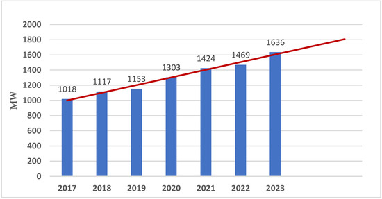 During peak load periods of the energy system in the winter season, consumption exceeds 1000 MW per year. In the winter of 2023–2024, the Central Power System experienced a peak load of 1636 MW on 21 December 2023 as shown in Figure 2.