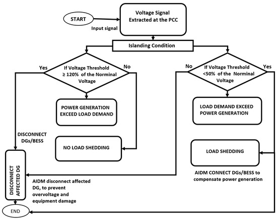 - Islanding condition detection: If the PCC voltage falls below 50% (<50%) or exceeds 120% (>120%) of base voltage threshold (base voltage being the rated system voltage), signaling a potential IC, according to the IEEE 1547-2003 standard, the AIDM will first disconnect the grid from the MG and then try to detect the islanding of any of its DG(s) or the BESS. If such an islanding is detected, then it will take measures to disconnect the faulted generator or storage and readjust the generation from the rest to restore power balance and power quality. It is to be noted that when the MG becomes islanded at the PCC, the control of frequency and voltage is taken up by the AIDM, but when it remains grid-connected, the same controls are executed by the main grid operator through centralized control systems. This AIDM function is shown in the flowchart of Figure 3.