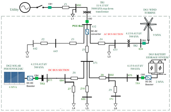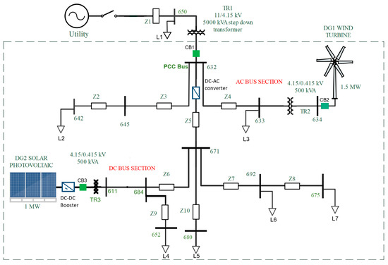 The schematic diagram of MG-TS I is shown in Figure 4. It consists of two DGs, a 1.5 MVA wind turbine (DG1), and a 1 MVA solar PV (DG2). The MG connects to the utility grid via PCC bus 632. The utility grid consists of the AC generation, bus 650, and transformer TR1 and it feeds the grid load L1. The MG has an AC bus section and a DC bus section. A wind turbine (DG1) feeds the AC bus section via transformer TR2. Loads L2 and L3 are supplied from the AC bus section. Similarly, solar PV (DG2) supplies the DC bus section that is coupled to the DC bus 671 via DC-DC boosters and transformer TR3. DC bus 671 is coupled to the main utility grid at the PCC bus 632 via a DC-AC converter. The DC bus section supplies the loads L4, L5, L6, and L7. The impedances Z1–Z10 balance the flow of voltage on the network and circuit breaker CB1 connects the MG to the utility at the PCC bus, while CB2 and CB3 connect DG2 and DG3, respectively. All transformers (TR1, TR2, and TR3) are identically rated 11/4.16 kV, 5 MVA, 50 Hz distribution transformers. All generators supply their loads via 3-phase distribution lines. The CBs designated as CB1, CB2 and CB3 are indicated in green in Figure 4 to highlight their positions in the system. The AC and DC bus sections are marked clearly in red labels “AC BUS SECTION” and “DC BUS SECTION” in the same figure to demarcate the two sections.