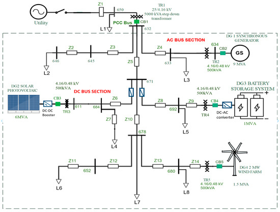 The schematic diagram of the MG-TS III is shown in Figure 6. This system consists of four DGs, a 9 MVA synchronous generator (DG1), 6 MVA solar PV (DG2), a 1 MVA BESS (DG3), and a 1.5 MVA wind turbine (DG4). The MG connects to the main utility grid at PCC bus 632. The utility grid consists of the AC generation, bus 650, and transformer TR1 and it feeds the grid load L1. The MG consists of two AC bus sections and one DC bus section. The synchronous generator (DG1) supplies the AC bus section I, which is coupled to the main grid via PCC bus 632 and TR2. AC bus section I supplies the loads L2 and L3. Similarly, the wind turbine (DG4) feeds AC bus section II, where the AC bus 678 is coupled to the utility grid at PCC bus 632 via TR5, an AC-DC converter, bus 671, and a DC-AC converter. Loads L6, L7, and L8 are supplied from AC bus section II. The DC bus section is supplied from the solar PV (DG2) and the BESS (DG3). DG2 is connected to DC bus 671 via a DC-DC booster and transformer TR3 while DG3 is connected to the same via its DC-DC booster and transformer TR4. DC bus 671 itself is coupled to the main grid at PCC bus 632 via a DC-AC converter. The DC bus section supplies loads L4 and L5. The impedances Z1–Z14 balance the flow of voltage on the network while CB1 connects the utility to MG, while CB2, CB3, CB4, and CB5 connect DG1, DG2, DG3, and DG4, respectively. It is to be noted that all transformers (TR1, TR2, TR3, TR4, and TR5) are identically rated 25/4.16 kV, 5 MVA, 50 Hz distribution transformers. All generators supply their loads via 3-phase distribution lines. The CBs designated as CB1, CB2, CB3, CB4 and CB5 are indicated in green in Figure 5 to highlight their positions in the system. The AC and DC bus sections are marked clearly in red labels “AC BUS SECTION” and “DC BUS SECTION” in the same figure to demarcate the two sections.
