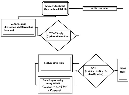 The proposed detection method follows a three-step approach; the first step involves the feature extraction of the three-phase voltage at PCC bus connecting the MG to the grid using DTCWT for feature extraction of the voltage signal. The aim is to extract the unique features from the voltage signal which can reflect the dynamic characteristics indicative of ICs. The second step uses SMOTE for preprocessing the dataset to increase the accuracy of the classifier. Finally, an ANN is used as the classifier for training and testing the proposed AIDM. The proposed method is tested and validated using an IEEE 13-bus test system modified into three different test MG systems consisting of multiple DGs, loads, and different topologies to extract fault/disturbance signals used to develop the AIDM algorithm.