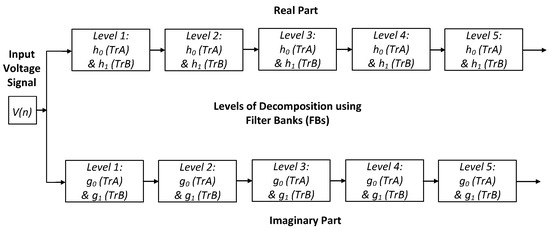 In Equations (10) and (11), V(n)TrA is the coefficient output voltage (real part) obtained from Tree A and V(n)TrB is the coefficient output voltage (imaginary part) obtained from Tree B. The filtered output of HB-LPF is further decomposed by 1/2 by another HB-LPF “g” and HB-HPF “” with half of the frequency of the previous one, with representing the real and imaginary parts. These can be expressed mathematically using Equations (12) and (13), as below: