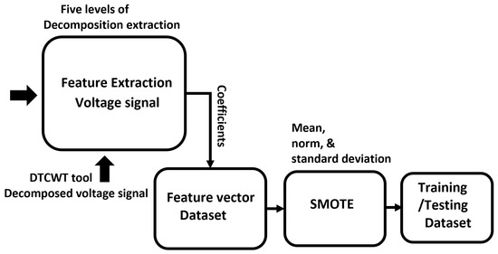 The flowchart of the proposed approach is shown in Figure 7. It shows how voltage signals are obtained in a discretized manner through a sampling process (where the time between each sample is given by 1/, where represents the sampling frequency) captured from the MG test systems at PCC bus 632, how the DTCWT is applied to decompose the voltage signal, how the extracted dataset is preprocessed by the SMOTE algorithm, and finally how training and testing of the dataset is executed for islanding detection. The detailed application of these steps is explained in Section 4.3, Section 4.4, Section 4.5 and Section 4.6.