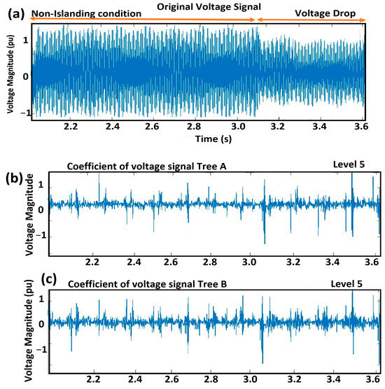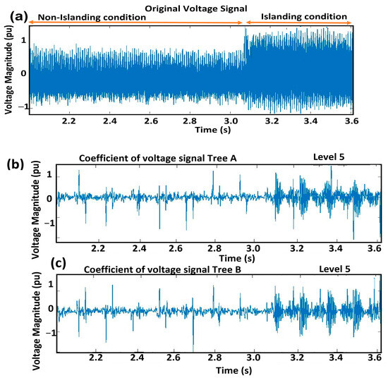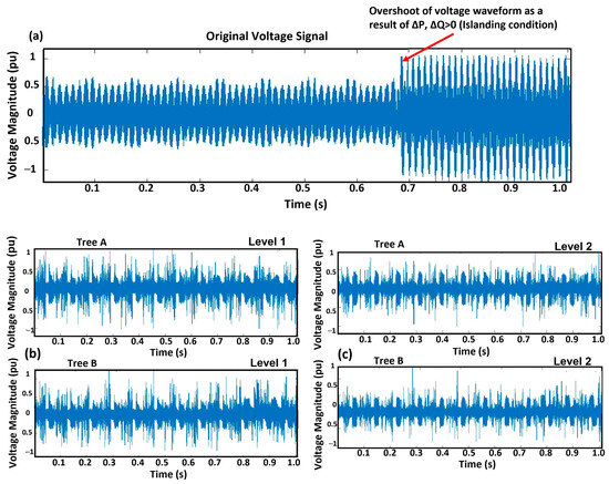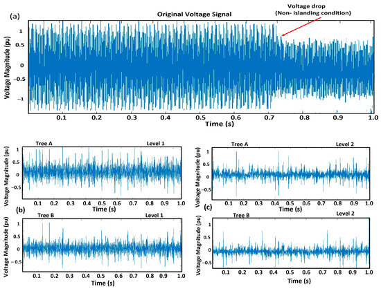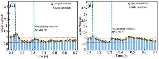 The primary objective of the AIDM is to protect the MG from potential overvoltage occurrences that may arise as a result of the PCC CB tripping. Under this scenario, the AIDM is designed to disconnect DG1 from the MG-TS I, readjust and restore the power balance (i.e., ΔP = 0 and ΔQ = 0), and correct the voltage deviation in the network. Figure 10a shows that during islanding the original voltage signal V(n) varies between +/− 0.5 pu and it overshoots to about +/−1.0 pu when islanding occurs at t = 0.7 s, thus crossing the voltage threshold range of 50–120%. Figure 10b shows level 1 decomposition (j = 1) for the and signals (output coefficient in pu) while Figure 10c shows level 2 decomposition (j = 2) for the and signals after DTCWT is applied to V(n). The decomposition result is used to extract the coefficient data points used by the classifier.