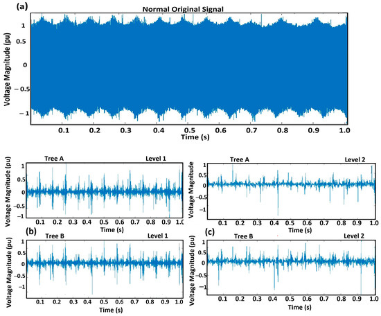 - Apply the dual-tree syntax code [dtcplxA, dtcplxD] = dualtree (wecg, ’Level’, J, ’Filter Length’, 1) to the voltage signal measured at different phases of the PCC bus under different fault/disturbance events for normal operation, IC, and NIC cases.