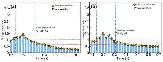 Power variation can be accompanied by an increase or decrease in the PCC voltage. When the PCC voltage crosses the 50–120% threshold, the PCC CB trips open, resulting in an IC. On the other hand, for NICs, the PCC voltage remains between the 50% and 120% thresholds when the PCC CB remains closed. The voltage threshold used for the simulation is given as <50% and 50% ≥ V ≥ 120% having a clearing time of 0.16 s, which gives standard guidelines for the design, operation, and integration of distributed resources with the utility network [5,29].