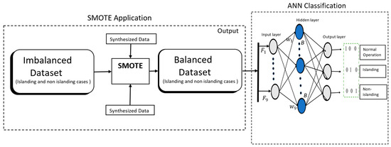 MGs comprise different DGs, such as solar photovoltaic (PV) systems, wind turbines (WTs), small hydropower systems, geothermal systems, biomass plants, battery energy storage systems (BESSs), etc., connected as a single network to the utility grid at a point of common coupling (PCC) at a certain integration voltage [2]. Proper control of bidirectional power flow and mitigation of voltage and frequency fluctuations in both the MG and the utility network are required for effective grid-connected MG operation. Faults within the MG network and in the grid may emerge under these conditions, making it difficult for the protection system to manage, detect, and clear them [3,4]. These faults and disturbances may lead to various technical issues and challenges in the control and protection of the MG network. One of these is islanding. An islanding condition (IC) can happen for the whole MG when it gets disconnected from the grid at the PCC. Traditional DGs have converters that are controlled to operate in a grid-following mode, and if they do not change to a grid-forming mode when islanding occurs, the DGs may continue to energize a part of the grid network. This is shown in Figure 1, where the circuit breaker (CB) trips the PCC bus as a result of a disturbance in the network. The DGs continue to energize the connected loads, which can be potentially hazardous for the servicing personnel and can cause consumer equipment damage and injury/fatality. On the other hand, when a fault, such as a line-to-ground fault, occurs on the MG network and the utility remains connected without tripping the PCC bus, this is known as a non-islanding condition (NIC) on the MG network. Islanding can also take place within the MG network, already disconnected from the grid, when some of its own DGs may become islanded, causing disturbances in its own stability and power quality. According to the IEEE 1547-2003 standard, any IC should be detected and prevented within 2 s [5]. An effective islanding detection method (IDM) should be fast-acting, cost-effective, and ensure reliability and resiliency of the DGs in the MG network [6]. To address this problem, this paper proposes a Dual-Tree Complex Wavelet Transform (DTCWT)- and SMOTE-based AIDM for a hybrid microgrid. The proposed AIDM is expected to detect and discriminate between ICs and NICs within the microgrid, considering that the MG is already disconnected from the grid at the PCC. The AIDM thus aims to protect the MG’s components and its own loads. By incorporating data from multiple DGs within the microgrid, this proposed method allows the AIDM algorithm to learn and classify faults/disturbances more accurately, enhancing its ability to detect ICs and NICs. By applying the diverse data inputs from multiple test MGs, the AIDM improves the robustness and reliability of its islanding detection. The output result is benchmarked with other existing similar methods, such as Support Vector Machines (SVMs), Extreme Learning Machines (ELMs), and grey wolf-optimized ANNs (GWO-ANNs), to evaluate the performance of the algorithm. It has been found that AIDMs outperform and show more robustness than other methods that rely on fewer or single-source data inputs, as in [7,8].