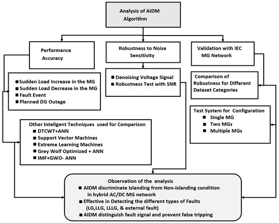 The rest of this paper is organized as follows: Section 2 presents a literature review of various intelligent techniques for islanding detection. Section 3 describes the function and novelty of the AIDM. Section 4 presents an overview of the proposed hybrid MG test systems, the various tools that are employed in developing the algorithm, and simulations of faults/disturbances in the test systems. Section 5 provides detailed analysis for the training, testing, and results of the proposed AIDM, including the classification, comparison, and validation of the proposed approach. Finally, Section 6 presents the conclusion and recommendations.