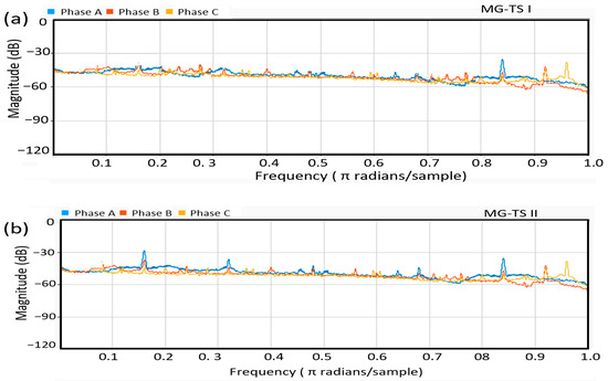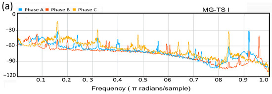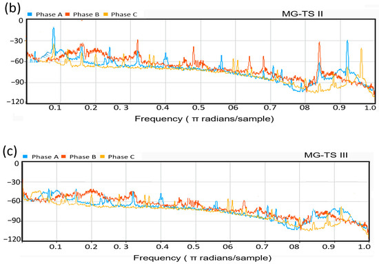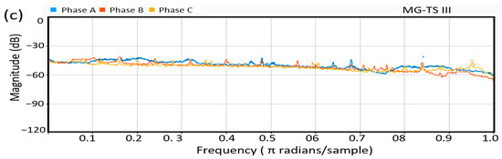 For DTCWT applications, the frequency spectrum for denoising V(n) is shown in Figure 21a and Figure 20b,c for MG-TS I, MG-TS II, and MG-TS III, respectively. Figure 21a indicates a transient overshoot of −37 dB when f = 0.85 π radians/sample for MG-TS I. Figure 21b shows transient overshoot of −29 dB when f = 0.025 π radians/sample for MG-TS II. Figure 21c shows no appreciable transient overshoots for MG-TS III for normal operating conditions.
