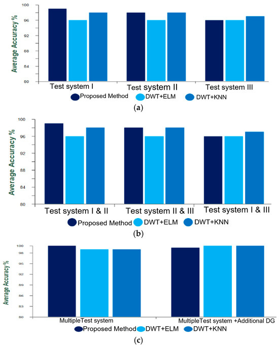The validation test is done with four different datasets categorized as follows: (a) dataset I (Ds1) consists of a dataset extracted from a single MG network (i.e., test system I, II, and II), (b) Ds2 consists of a dataset from the combination of two test system (MG-TS I + MG-TS II, MG-TS II + MG-TS III, and MG-TS I + MG-TS III), (c) Ds3 comprises data from a combination of multiple system (MG-TS I + MG-TS II, + MG-TS III), and finally (d) Ds4 consists of a dataset from the application of additional DG units in the form of a BESS (1 MVA, 1.5 MVA, and 1.5 MVA) to each of MG-TS I, MG-TS II, and MG-TS III, respectively. The performance of the proposed technique is also compared with other classifiers such as the DWT + ELM and DWT + KNN method.