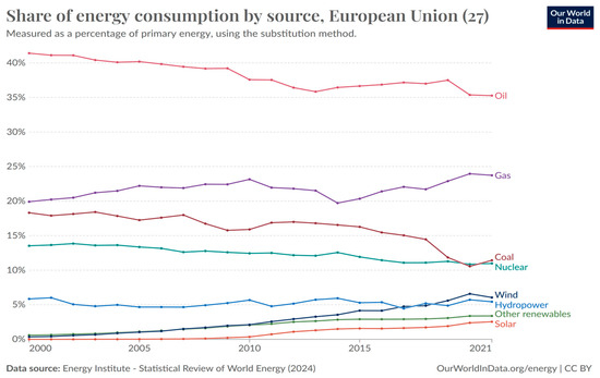 Share of energy consumption by source in European Union (27) in 2000–2021. Source: Our World in Data [12].