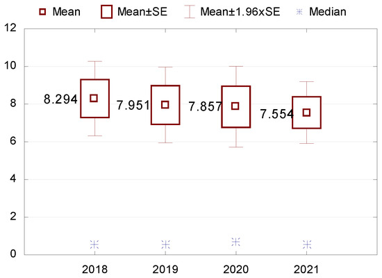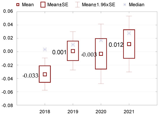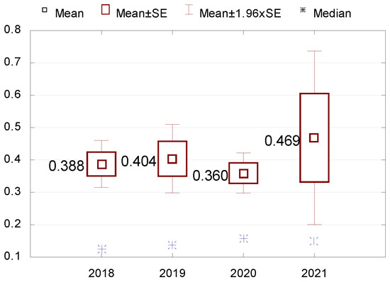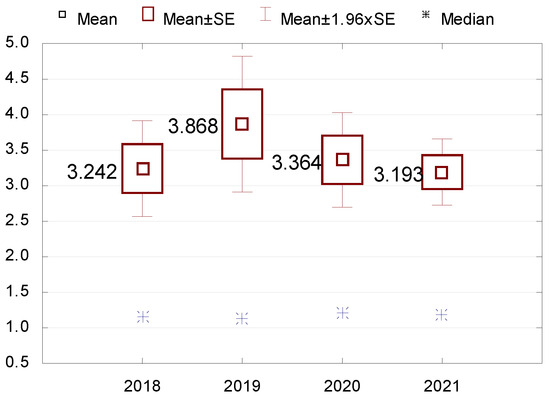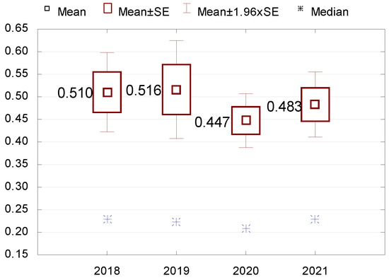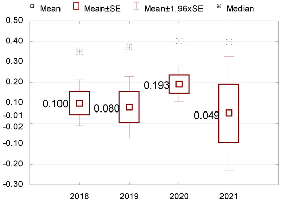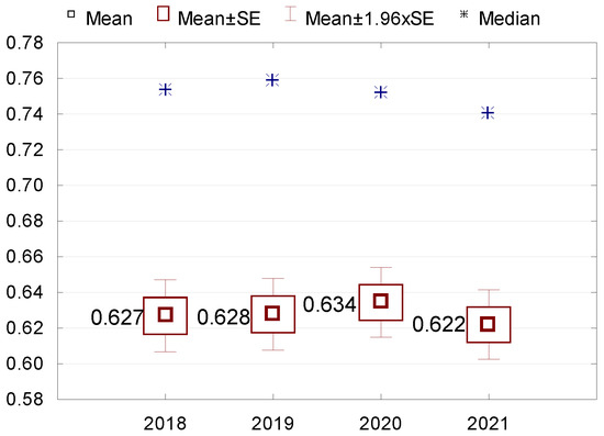 Stage 3. Descriptive statistics (mean, median, minimum and maximum values, standard deviation, coefficient of variation, skewness and kurtosis) are performed for variables that turn out to be statistically significant. The Wilcoxon pairwise rank test is used to check the differences in indicators between the individual years of the study. All results are presented in figures and tables.