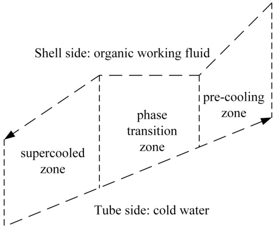 The tube side of the evaporator is a high-temperature fluid, and the shell side is an organic power generation medium. Since the high-temperature fluid on the tube side does not undergo a phase change, the evaporator is divided into a preheating zone, phase change zone, and superheating zone according to the phase change process of the organic working fluids on the shell side using the moving boundary method. Then, the heat transfer model is established using the mean logarithmic temperature difference method. The heat transfer model using the mean logarithmic temperature difference method can be expressed as [20]