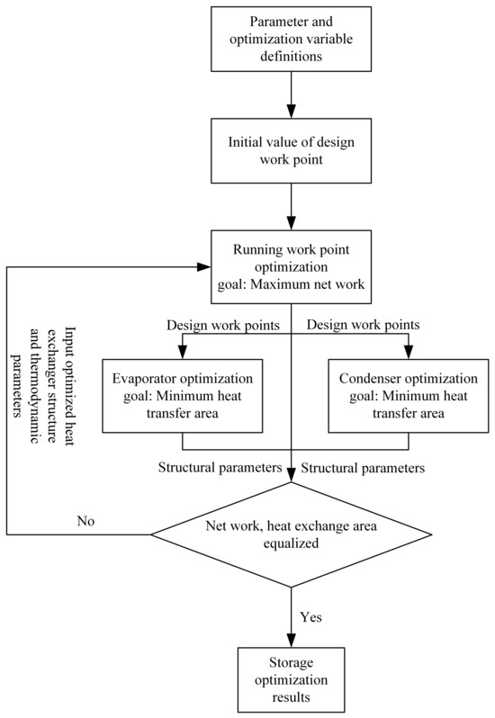 The parameters, as well as the optimization variables, are first defined, followed by designing the initial values of thermodynamic parameter operating points to run the operating points with the optimization objective of the net system work, followed by developing the heat exchanger structural parameter operating point dispositions to optimize the evaporator and condenser structural parameters with the aim of a minimal heat exchanger area. The optimization results are stored in the system network, and the heat exchanger area reaches equilibrium. If the system network and heat exchanger area reach equilibrium, the optimization results are stored; if the heat exchanger area and network do not reach equilibrium, the optimized thermodynamic and heat exchanger structural parameters are input to continue the iteration until the heat exchanger area and network reach equilibrium. Figure 7 gives the flowchart of the ORC system design optimization method based on the Stackelberg game.