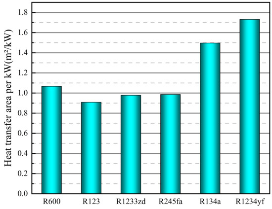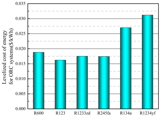 It is reflected that R123 has high heat transfer efficiency in the low-power scene. While R134a and R1234yf have larger heat exchanger areas, indicating that they are not well matched with the heat source. In contrast, R600, R123, and R1233zd also have advantages in heat transfer efficiency, and the comparison results of the levelized cost of energy are given in Figure 10 by combining the network and heat exchanger area.